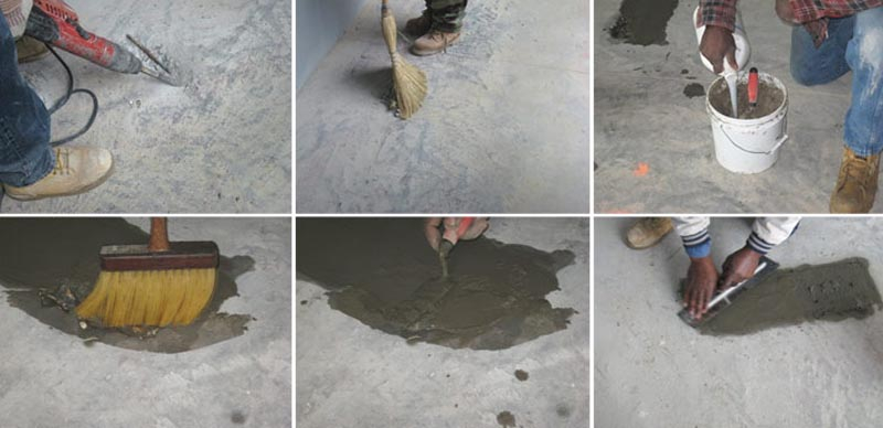 - очистить, а если потребуется и отслоить рыхлое старое покрытие от кусков цемента, цементной пыли и прочего мусора сухой жесткой щеткой. Удалить масляные пятна, обезжирить также иные пятна;
