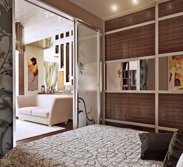Если есть возможность, часть помещения отделяют, создавая отдельную спальню. Это можно сделать при помощи раздвижных дверей. Если двери слишком мешают, можно повесить шторы — нитяные или японские создают иллюзию отдельного помещения, а при необходимости раздвигаются.
