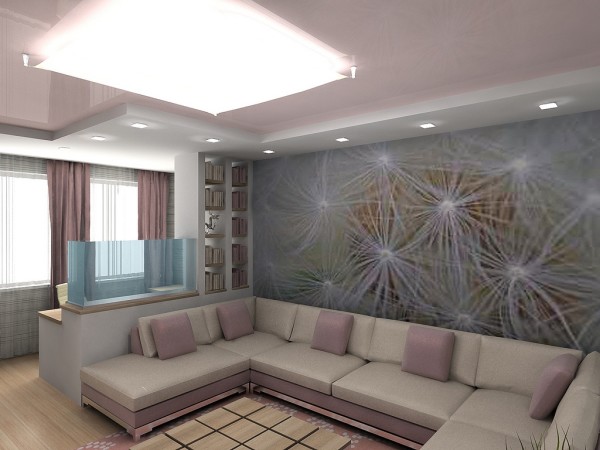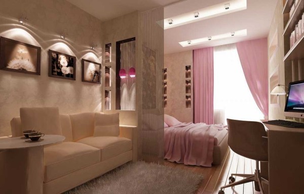 | Легкий, воздушный интерьер | Для визуального увеличения пространства можно использовать зеркальные поверхности, зонировать с помощью перегородок из легких, полупрозрачных тканей, тонкого, крепкого стекла. Если перегородки не нужны, зонирование можно сделать во время ремонта. Здесь важным моментом является грамотный подбор отделочного материала. Пол в разных зонах должен различаться: на кухне – плитка, гостиная в ламинате. В спальной зоне можно постелить пушистый ковер. Каждая зона должна иметь индивидуальное освещение. |
