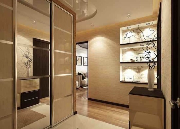 Чтобы пространство было визуально шире, можно разместить большое зеркало. Модель обувницы – узкая, сверху с сиденьем. Если кладовка отсутствует, в помещении устанавливается небольшой шкаф-купе. Лишние детали в виде полочек, ваз лучше не ставить. Основной световой элемент лучше разместить над зеркалом.