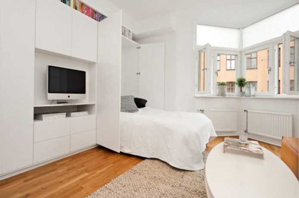 Опускающаяся кровать днем выглядит как шкаф…даже полочка есть
