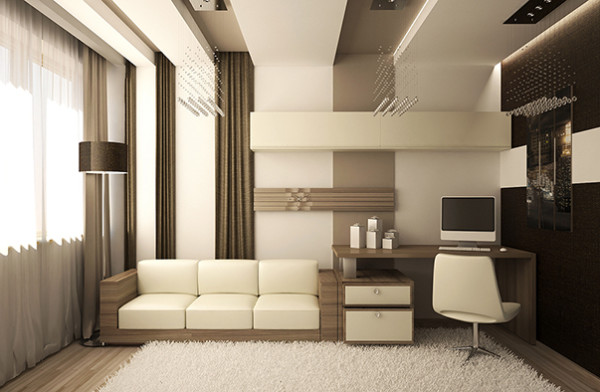 Дизайн однокомнатной квартиры в бежево-коричневых тонах. Удачно сделанный потолок, пуст и темного цвета, зрительно делает помещение просторным