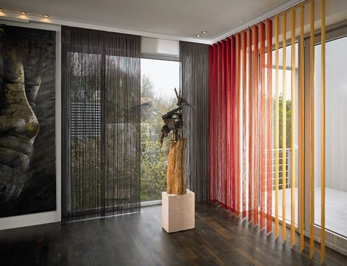 Разноцветные нитяные занавески обычно являются зонирующим элементом в квартире-студии либо объединяющим несколько окон. Такое «рассыпающееся» изделие часто используется вместо тюля, представляя собой отдельные узкие полоски, сверху закрепляемые на общей ленте. Они изготавливаются из вискозы, полиэстера, декорируются бусинами, пайетками, буклированными элементами. Изделие может практически полностью состоять из цветного бисера, ярко окрашенных бамбуковых либо пластиковых трубочек.