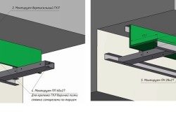 Если стены неровные, то для монтажа UD нужно воспользоваться П-образными провесами. После фиксации пристенных планок устанавливаются остальные направляющие. Между собой они стягиваются саморезами с пресс-шайбами.