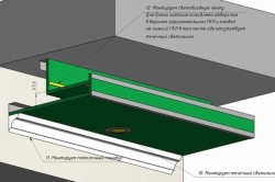 Если в верхнем ярусе предусмотрены встроенные светильники, то необходимо заранее провести провод внутри верхнего короба, сделать отверстия для освещения, и вывести из этих отверстий отрезок провода.