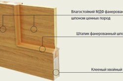 Высокая стоимость деревянных конструкций делает их не самым доступным вариантом – особенно для бюджетного ремонта. Для снижения цены из дерева выполняется только каркас. Сверху наклеиваются листы шпона – материала, получаемого склеиванием тонких срезов древесины.