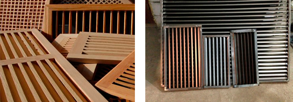 Чаще всего решетки для вентиляции делают из металла и пластика, намного реже встречаются деревянные. Металл — алюминиевые сплавы или оцинкованная сталь, реже — нержавеющая сталь, бронза, медь и латунь.
