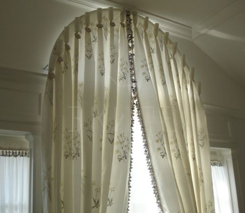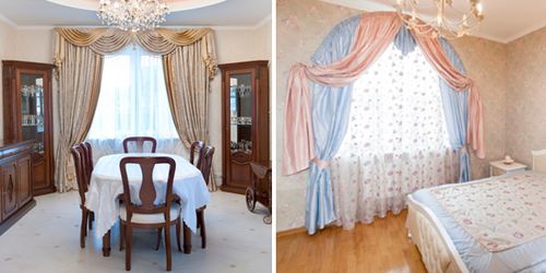 Шёлковые ткани хорошо драпируются, с ними легко работать, используя более сложные и замысловатые фасоны для декора. О том как, красиво декорировать и украсить окна нестандартной арочной формы смотрите тут.