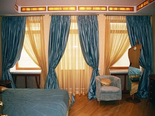 Шелковые шторы из трех полотен станут превосходным дополнением для гостиной, для спальни на фото. Однако, чтобы текстиль органично вписывался в дизайн интерьера, важно учитывать стилистическое направление. Наиболее элегантно и роскошно, шелк смотрится в классическом интерьере.
