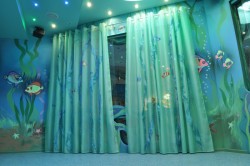 В детскую подбирают шторы, защищающие от яркого света. Чаще всего это сочетание легкой прозрачной вуали с плотными портьерами. Также шторы могут быть с рисунком героев любимых мультфильмов (вариант для самых маленьких). Слишком яркие цвета для занавесок в детской не рекомендуют использовать, так как они будут раздражать нервную систему ребенка, не давая уснуть или просто успокоится.
