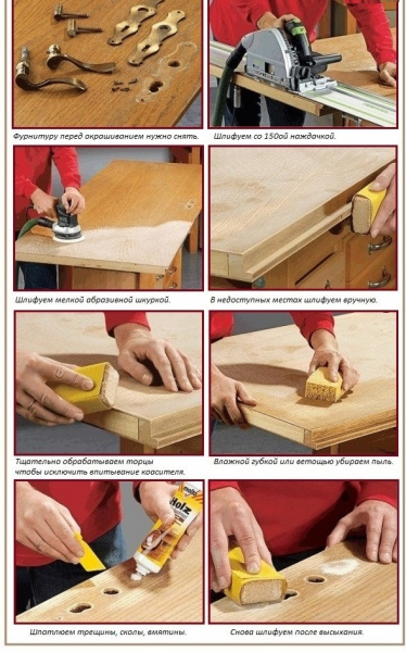 - Полотно снимают с петель, укладывают горизонтально, снимают фурнитуру. Старое покрытие удаляется с помощью наждачной бумаги или растворителя. Неглубокие дефекты шлифуют мелкозернистой наждачкой.