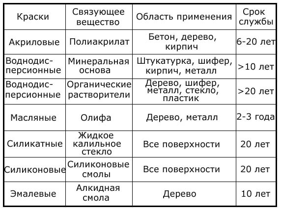 Таблица разновидностей красок.