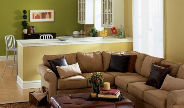 - С коричневым. В этой комбинации результат зависит от степени насыщенности коричневого. Чем он светлее, тем в большей степени получится высветлить болотный фон. Ну а если коричневый будет приближен к более темному спектру, то восприятие интерьера будет более тяжелым.