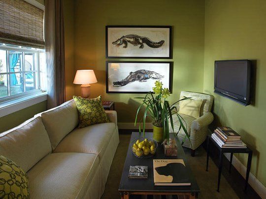 - Небольшую гостиную можно оформить в стиле кантри или прованс, подобрав обои в бело-зеленую клетку или однотонные светло-зеленые.