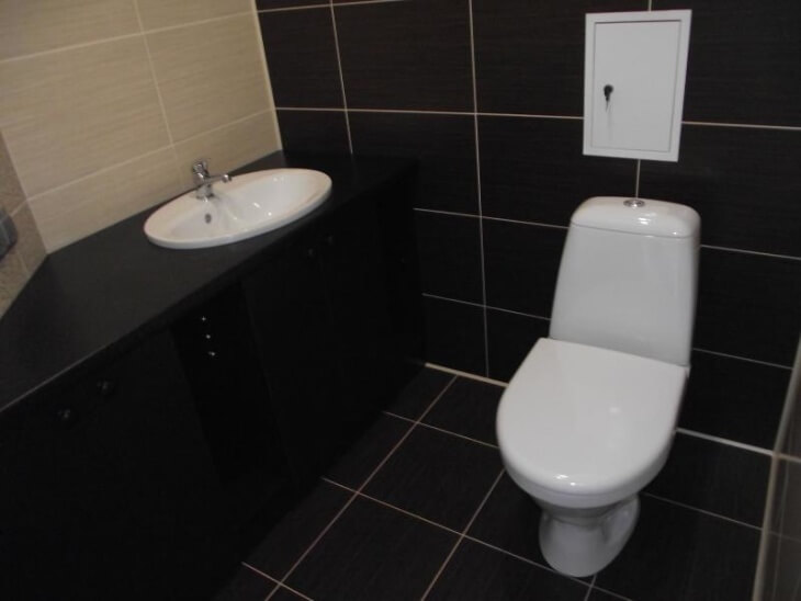Новинка в стиле строительства – пластиковые панели, имитирующие кафельную облицовку. Их используют для отделки санузла в тех зонах, где нужен беспрепятственный доступ к коммуникациям. Сочетание цвета и фактуры тоже подбирают так, чтобы декор получился гармоничным.