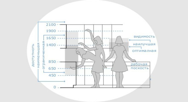 - очень низкая — от пола 40 см, зона с минимальной доступностью, неудобна в использовании, подходит для хранения инвентаря, который редко используется или тяжелой посуды;