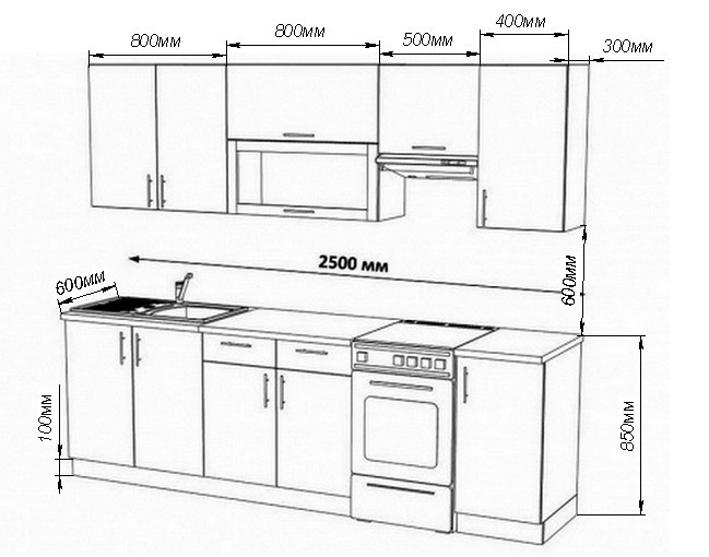 До покупки создается план кухни, который демонстрирует правильное расположение мебели. Типичные варианты по модульной системе имеют длину 1,8—2,6 м.