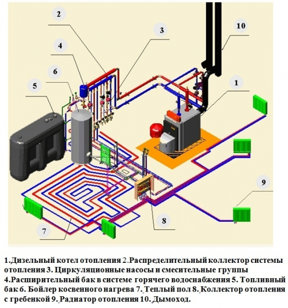 Организация отопления в частном доме дизельным котлом, выполняется с соблюдением следующих условий: