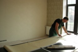 Обратите внимание на то, что подложку следует клеить горизонтально. В противном случае, стыки подложки будут видны сквозь обои.