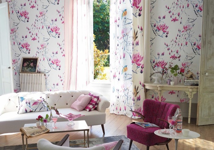 Под такие обои подойдет легкая светлая мебель. Желательный момент – перекличка с цветами. Например, цветочные же подхваты для штор или цветочный принт на ковре, диванных подушках и т.д.