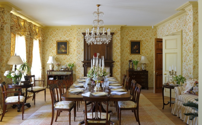 Обои в английском стиле хорошо сочетаются с плотными шторами, хрустальными люстрами, камином, антикварными предметами интерьера и конечно же кожаной мебелью.