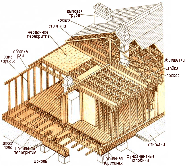 Существуют несколько технологий строительства каркасного дома: канадская, финская, немецкая, с использованием деревянной или металлической основы. Но в любом случае в конструкцию входят следующие элементы: