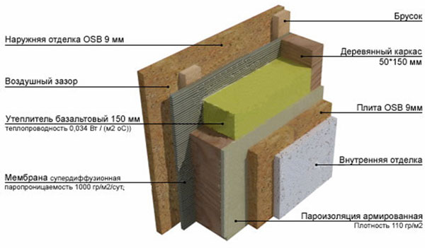 Готовый каркас обрабатывают антисептиками, хорошо просушивают и обшивают плитами OSB. Образовавшиеся ячейки заполняют утеплителем – минеральной ватой или пенополистеролом. Толщина слоя зависит от назначения дома – для постоянного проживания требуется не менее 15-20 см. Стеновой пирог выглядит следующим образом: