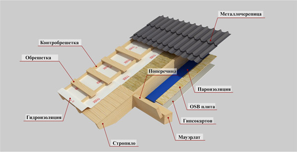 Следующий слой – пароизоляция, после которой следует OSB-плита или плотно сшитые доски (на выбор застройщика). Монтаж пароизоляции, равно как и гидроизоляции осуществляется с напуском для исключения попадания влаги в утеплитель.