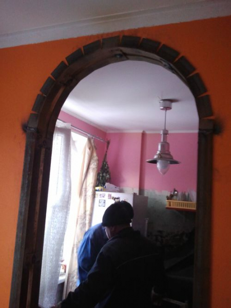 Также, применяя деревянный брус или аналогичный предмет, следует приготовить распорку (длиной, равной расстоянию от пола до верхней точки арки), за счет которой декоративный уголок будет удерживаться в заданном положении (до застывания клея).