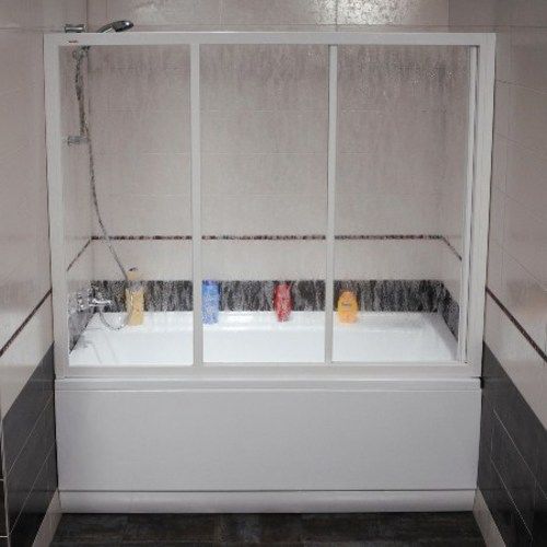 Самая легкая конструкция – трехстворчатая система, в которой две створки будут являться неподвижными, в то время как третья будет подвижной и заменит дверцы. Вам понадобятся две вертикальные стойки для крепления на стене и направляющие, которые будут крепиться вверху и внизу конструкции. Еще нужно приготовить три створки. Нижнюю направляющую следует крепить на бортик ванной, а верхнюю на расстоянии 120-140 см вверх.