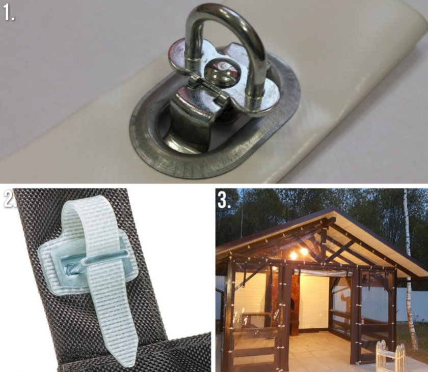 Используют различные виды крепления, например поворотные скобы или скобы с ремешками, круглые или прямоугольные люверсы. Установка пластиковых шторных конструкций из ПВХ: