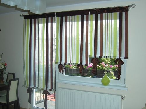 Занавеси этого типа до подоконника по внешнему виду похожи на жалюзи офисного типа, но изготавливаются они из тканевого полотна. Они выглядят намного легче и уютнее.