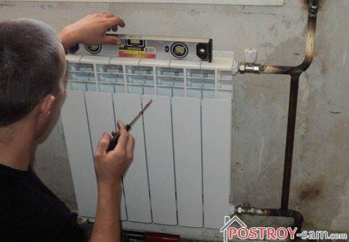 После слития воды из системы, производим демонтаж старых батарей. Эти действия не предполагают ничего сверхъестественного. Нужно просто развинтить резьбовое соединение ваших старых батарей или же, банально, разрезать их болгаркой. В процессе ремонтных действий, во избежание травм, обязательно, соблюдайте правила техники безопасности. Монтаж нового радиатора отопленияДалее производится подгонка и навес (монтаж) отопительного радиатора. Подгонка – это важнейший этап сантехнической работы. Предполагает, точное выведение горизонтали и вертикали, а так же, удаление всех перекосов и дефектов. Для точного определения места конструкции, как правило, используют обычный строительный уровень. Монтаж нового радиатора отопления, производить «на глаз», категорически запрещено. Действия «на глаз», как правило, создают проблему с присоединением батареи и ухудшением циркуляции теплоносителя. Но так же, нарушает красоту (визуальное восприятия) объекта.